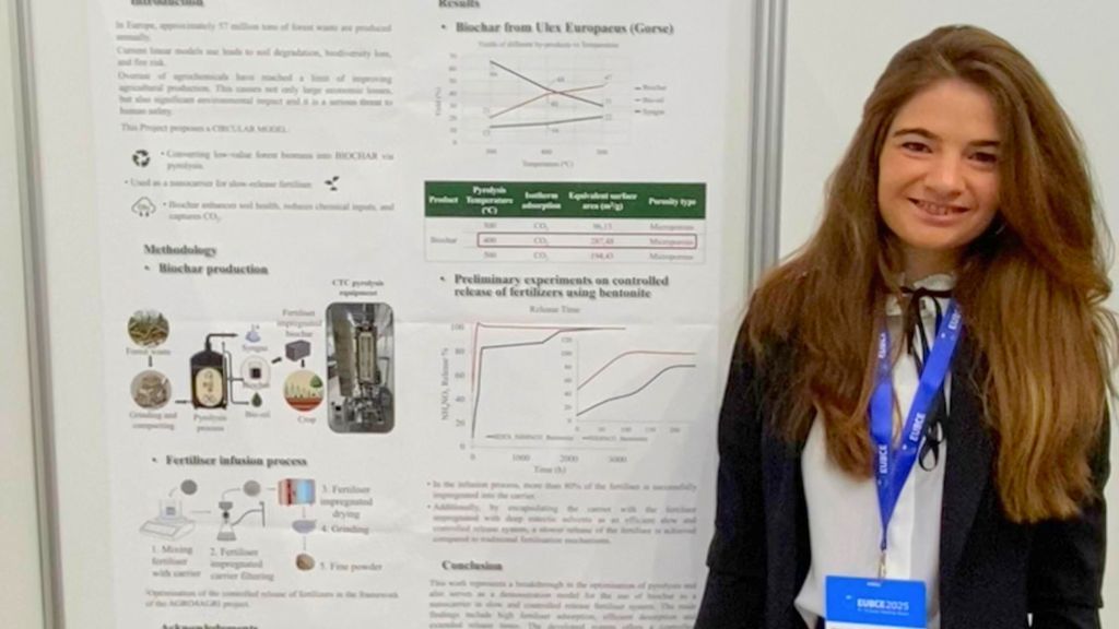 El Centro Tecnológico CTC ha desarrollado un sistema innovador para el uso de biochar en los procesos de liberación controlada de fertilizantes. El trabajo, liderado por el equipo del área de Materiales Avanzados y Nanomateriales y presentado por María Magdalena Peña en el 33rd European Biomass Conference and Exhibition (EUBCE 2025), ha generado gran interés por ser pionero en la valorización de recursos forestales y en la promoción de modelos de bioeconomía circular,