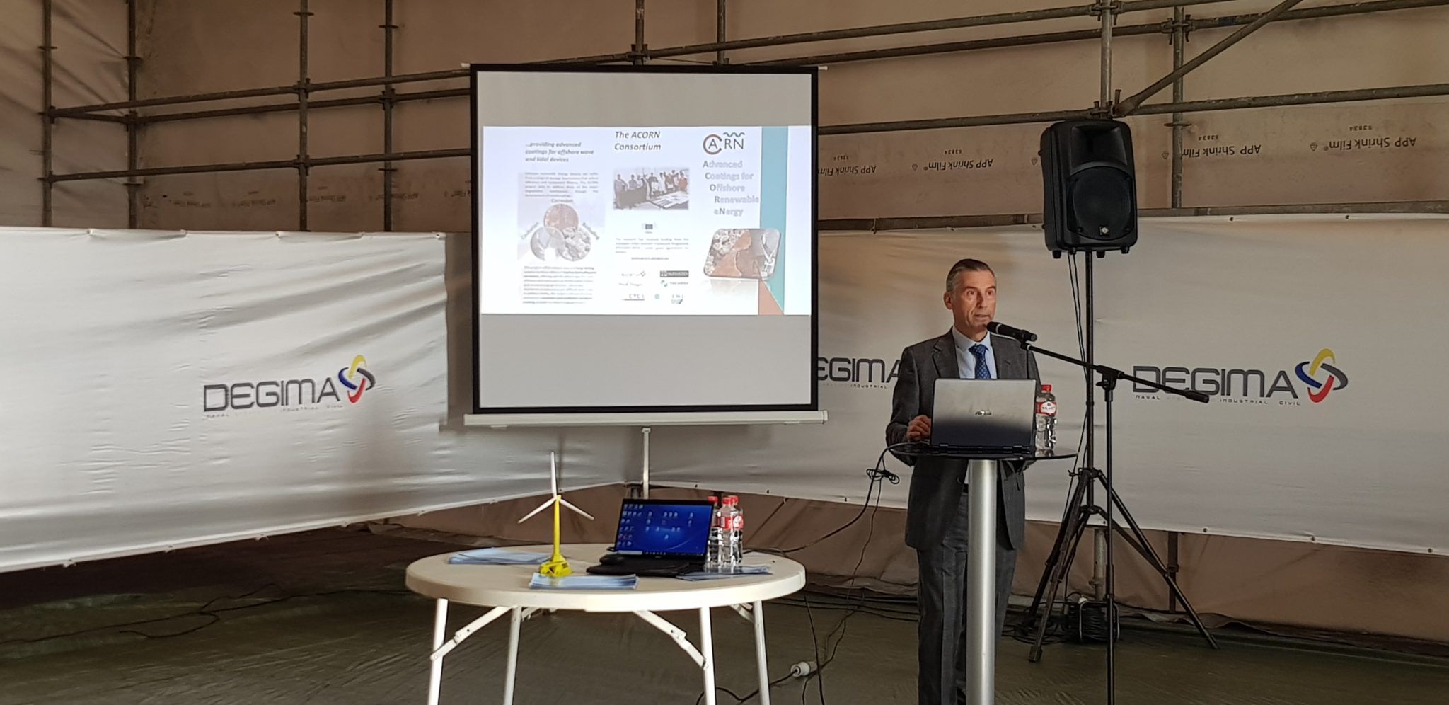 Durante su intervención, Juan Manuel de la Colina, director gerente de DEGIMA, destacó alguno de los proyectos innovadores en los que están trabajando actualmente. Así, presentó el prototipo a escala de aerogenerador flotante BlueSATH, desarrollado junto a SAITEC, la vela rígida de Bound4Blue, o el proyecto ACCEDE para garantizar el paso seguro entre plataformas eólicas marinas. Además, significó alguno de los proyectos que han ejecutado con CTC en los últimos años. Así, puso de manifiesto la importancia de ACORN, una investigación europea para desarrollar recubrimientos resistentes al biofouling y la corrosión marina.