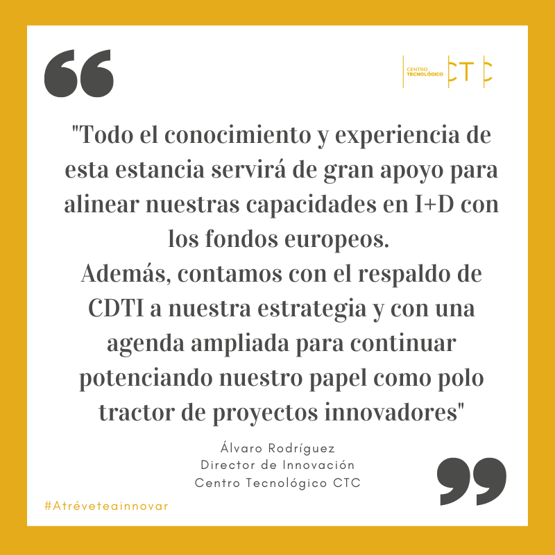Mis objetivos a la vuelta son, al mismo tiempo, gratificantes y retadores: aumentar paulatinamente la tracción de proyectos internacionales a CTC, inspirar al resto de compañeros sobre las ventajas de colaborar con otros socios a nivel internacional y ser el punto de referencia dentro de nuestra organización en materia de convocatorias europeas. Todo ello con la misión de alinear nuestras capacidades en I+D con los fondos europeos, lo que nos hará más atractivos para las empresas con las que colaboramos.