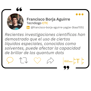 Recientes investigaciones científicas han demostrado que el uso de ciertos líquidos especiales, conocidos como solventes, puede afectar la capacidad de brillar de estos quantum dots. Estos solventes ayudan a ajustar el brillo y la coloración de la luz que emiten. Lo interesante es que ahora se están usando solventes derivados de fuentes naturales, que son más eficientes, menos tóxicos y más baratos de producir. Dicho de otra manera, se está abriendo la puerta al empleo de nuevas moléculas para obtener productos de interés en la industria reduciendo considerablemente su impacto medioambiental y sobre la salud de las personas.